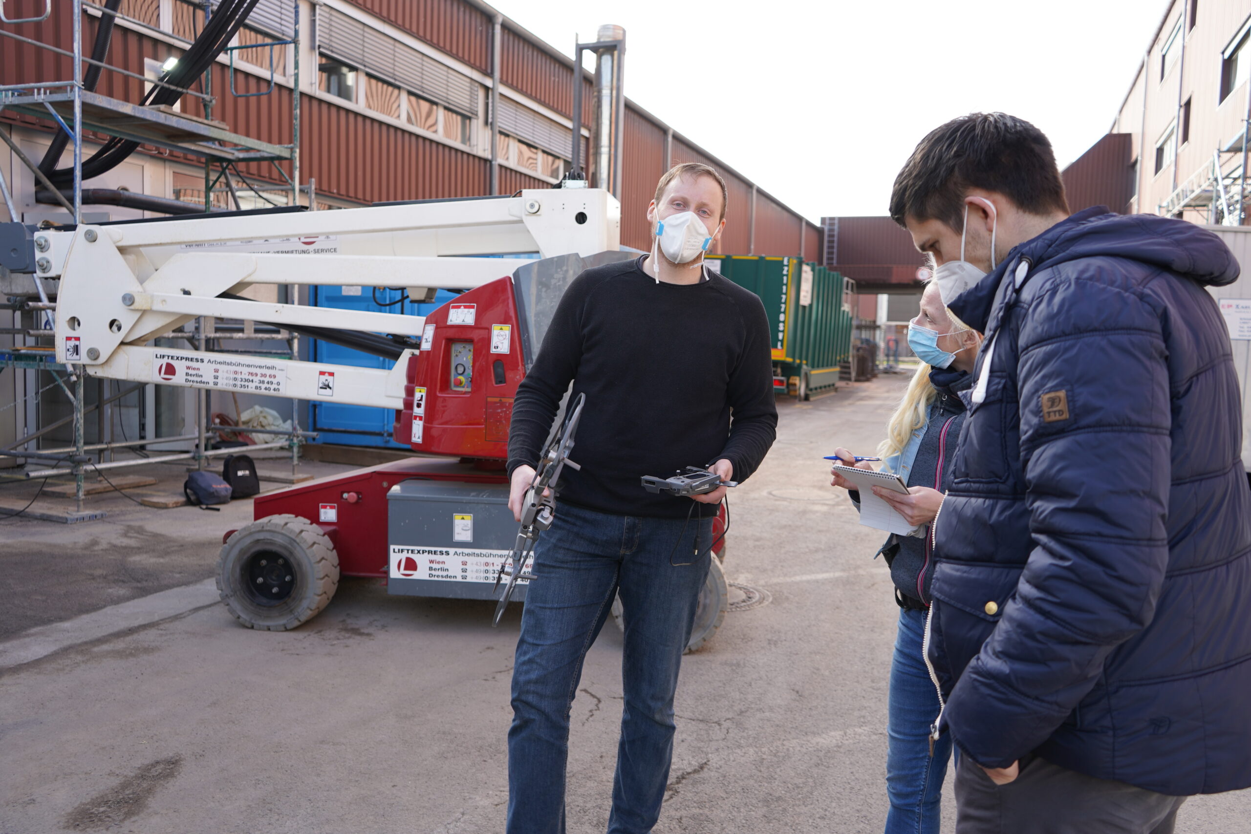 Erstellen eines ersten einfachen 3D-Übersichtspanoramabildes, Lagebesprechung mit dem Teamleiter, Piloten und den Brandermittlern